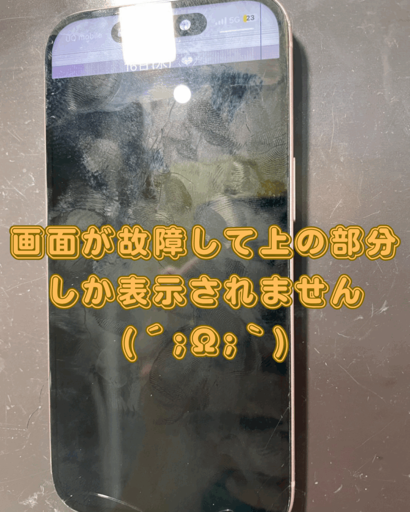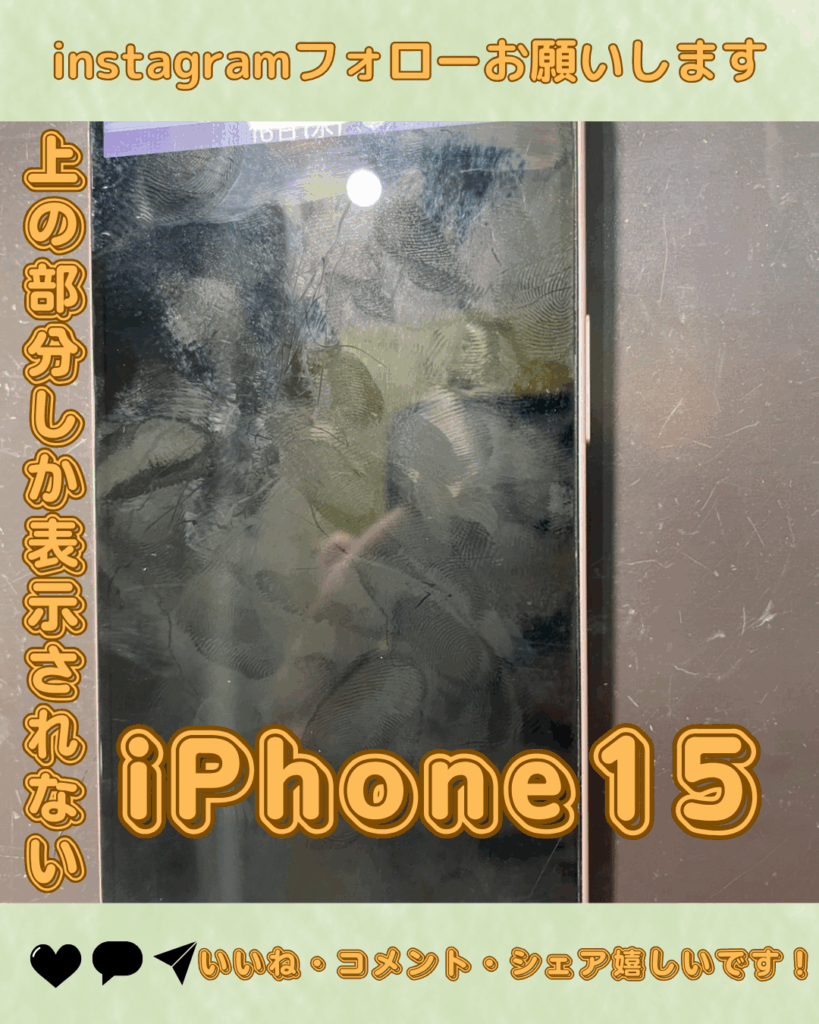 珍しい画面故障のiPhone15をお持ち込み頂きました☆落とした際の衝撃で画面が真っ暗になったのですが、上部のほんの少しの部分だけは表示される状態でした。この状態でも画面交換で改善が可能ですので早速画面パネルを交換してハッキリと見える状態にしていきましょう(‘◇’)ゞ