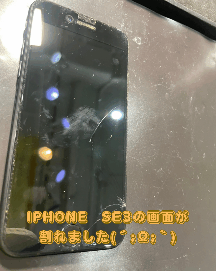 今回お持ち込み頂いたiPhoneSE3もガラス部分が割れてしまっている状態でした。