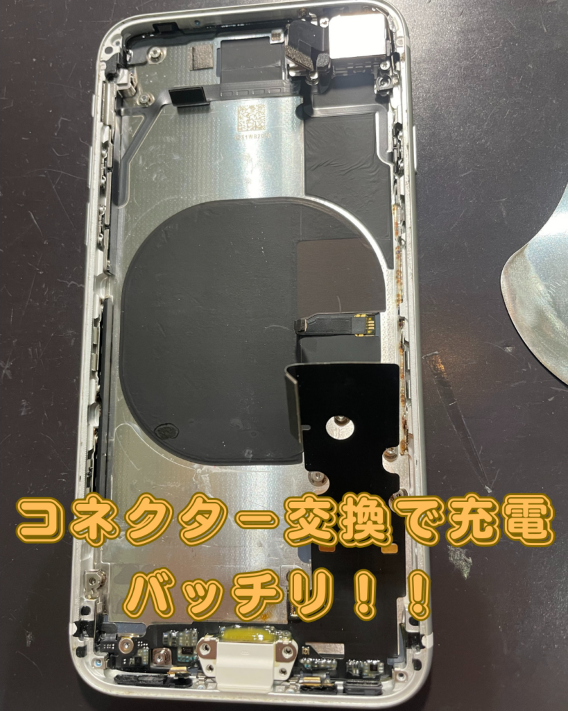 背面充電を使って充電は出来ますが、iPhoneを固定させておく必要もあるので中々に不便な事もあります。やはり従来からの充電方法であるコネクターも正常に充電出来る状態にしてあげると非常に便利ですよ(^^♪画面交換やバッテリー交換より取り外すパーツが多い分長めに修理時間を頂いていますが、基本はその日にお預かりしてその日にお渡しさせて頂いております。是非バッテリー交換、画面交換、カメラ交換等の際に一緒にコネクター交換もご依頼下さい(‘◇’)ゞご来店お待ちしております!