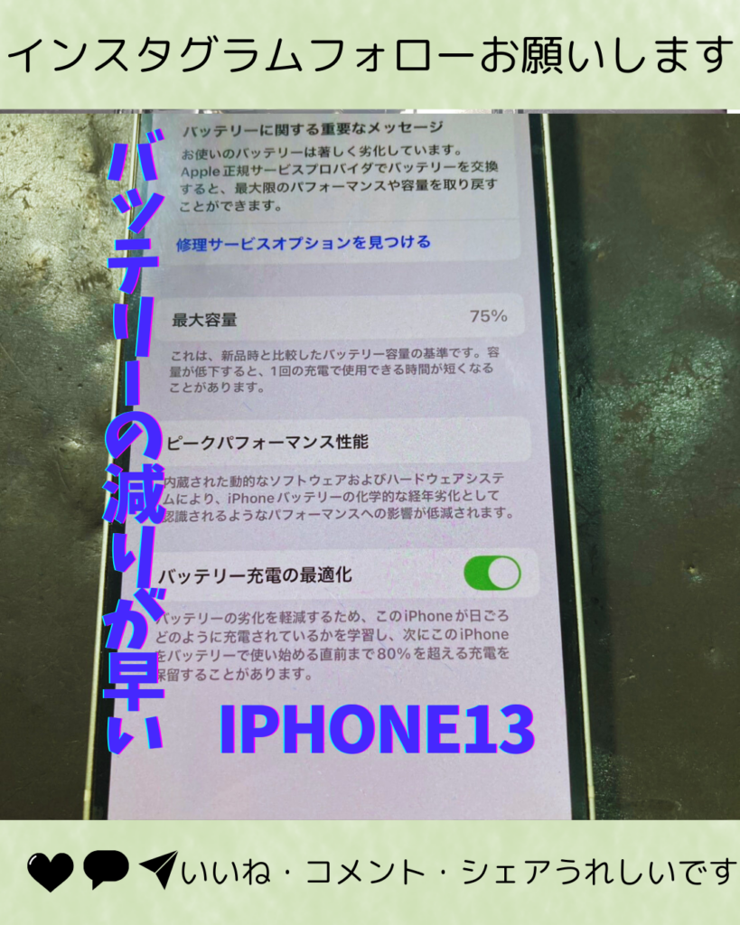 今回はiPhone13のバッテリー交換をご依頼頂きました。最近特に減りが早いとの事です。