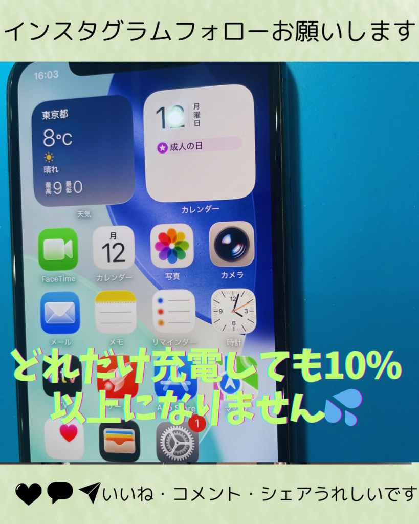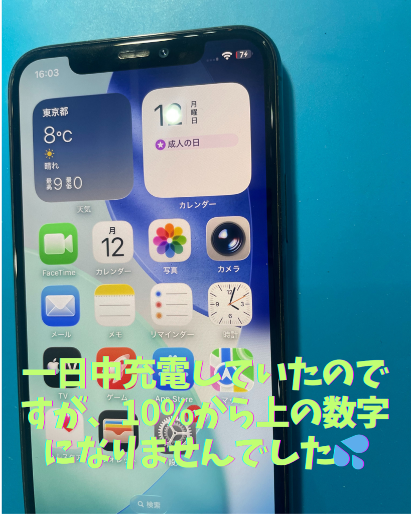 まず、お持ち込み頂いた状態で充電を20分間程実施しました。確かに10%の表示から上の数字になる事はありませんでした。次にソフトウエアの不具合の可能性がありますので再起動を実施した状態で改善があるかを確認しました。しかし、バッテリーの%は相変わらず10%のままです。お客様から修理同意書を頂いていますのでiPhoneを開閉してバッテリーの再接続を試してみましたが、依然増えて行きません。となると基板の不良によって表示がおかしくなっている、もしくはバッテリー自体の不良の可能性が見えてきました👀バッテリーを仮付け状態にして充電を実施しました……………………………………………………