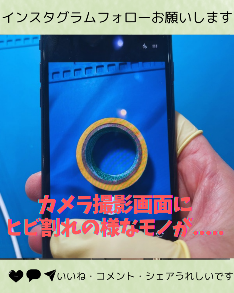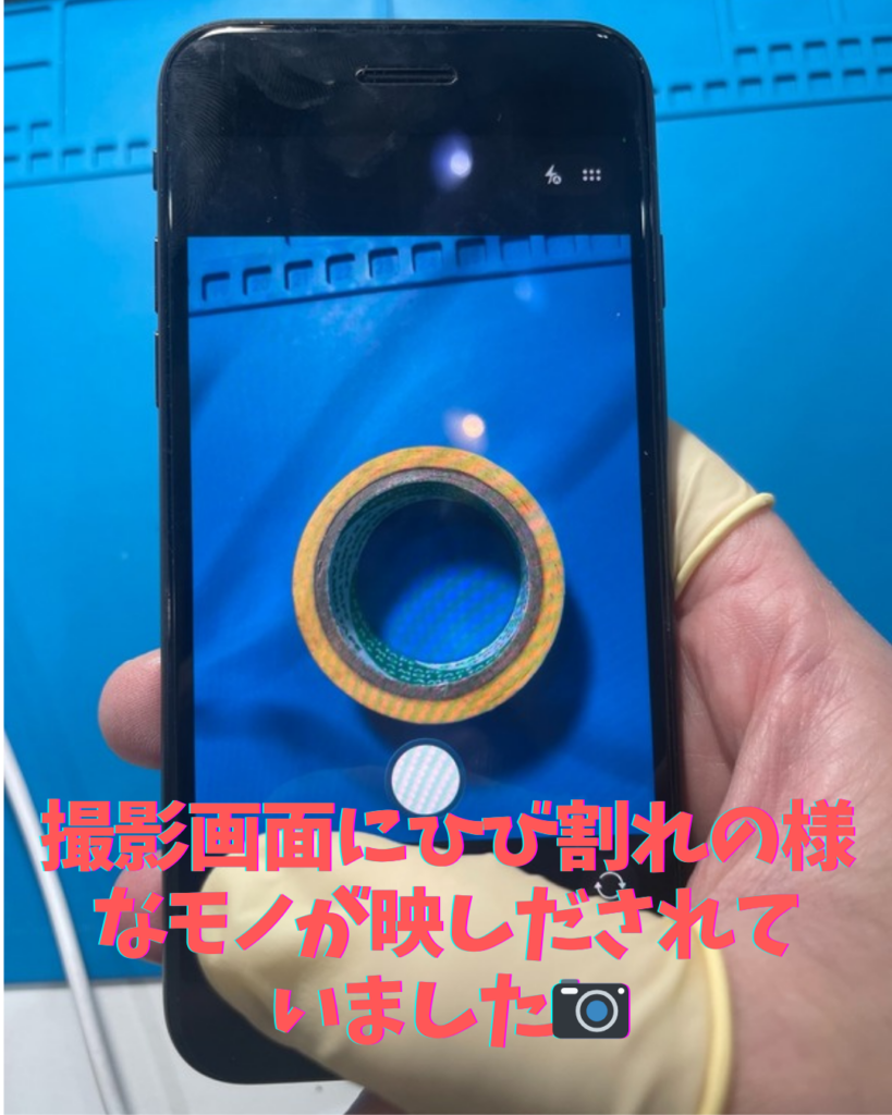 カメラの撮影画面に黒いひび割れの様なモノが写りこんでしまうとの事でした。実際に撮影画面を確認してみると確かに黒い線が画面全体に広がっています。これはアウトカメラ自体に損傷がある状態になりますのでアウトカメラを交換すると改善する事が出来ます。さっそくアウトカメラを交換してみましょう(‘◇’)ゞ