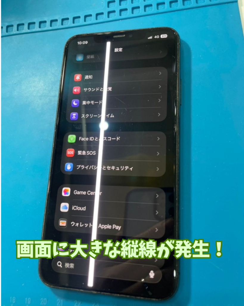 今回お持ち込み頂きましたのはiPhone11ProMaxになります。11シリーズでもっとも大きいサイズのiPhoneです。端末を落としてしまった際に画面に縦線が発生してしまったそうです。今の段階では少し大きめの縦線でかろうじて画面表示を確認する事ができますが、損傷が酷くなってしまった場合は光の線で画面が覆われてしまって画面表示を確認する事は困難になります。早めに画面交換にお持ち頂いた事は非常にグッドです!お困りの方は是非早めの修理をして下さいね(^^♪