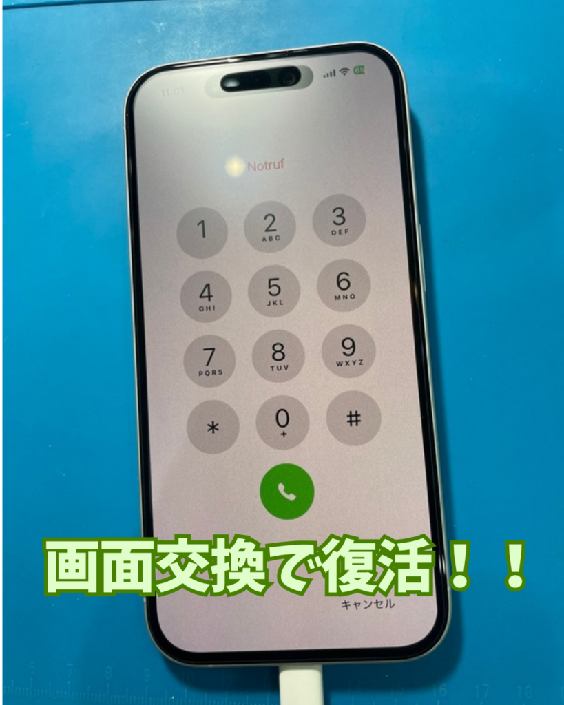 画面交換後のiPhone16です。以前液晶画面パネルで修理されていたそうですが、今回はより純正パーツに近い有機ELパネルでの交換を選んで頂きました。液晶画面よりも価格は少し高いですが、それだけのメリットがある人気のパネルです。もちろん買い替えが近い方やデータだけ見れたら良い、普段使いに問題なければ画質は気にならない等の方は液晶画面パーツでより安価に修理して頂くのも良い方法です。ご自身にあったパネルを選んで交換して下さいね(^^♪